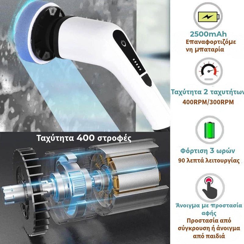 MultiKatharistís Ηλεκτρική Ασύρματη Συσκευή Καθαρισμού διαθέτει τρία ρυθμιζόμενα μεγέθη, διπλές ταχύτητες και 7 ανταλλακτικές κεφαλές βουρτσών. Πείτε αντίο στο σκύψιμο και το γονάτισμα κατά τον καθαρισμό, καθώς αφαιρεί εύκολα τις επίμονες λεκέδες σε κάθε γωνία και μειώνει σημαντικά τον χρόνο εργασίας σας από 1 ώρα σε 15 λεπτά. Εξοικονομήστε χρόνο, κόπο και χρήματα στον καθαρισμό του σπιτιού σας.